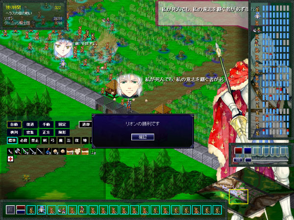 クーニッツ騎士団を追い返してリオンのターンが始まりました。いくつかの勢力が共闘したけど解説は後日します。防衛戦は有利ですね。わざと敵をおびき寄せる作戦は有効に違いない。しかし、俺は攻め攻めの戦いが好きなのだ。