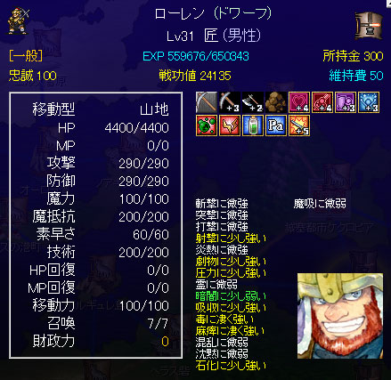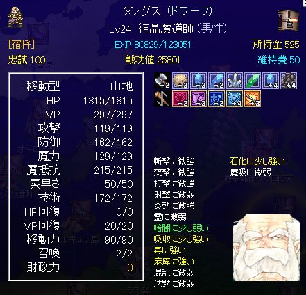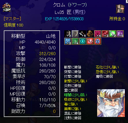というわけで、ドワーフを叩くのは今がチャンスなんだよ。人材ユニットの能力を調べたら出現しましょう。マスターのクロムは全ユニット中、レベルの値が最大の35だ。防御力や魔抵抗が高くて欠点が分からん。