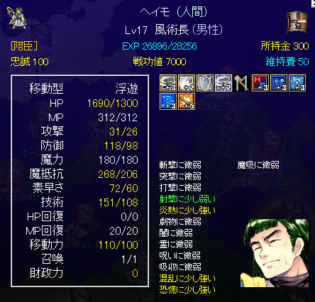 最後はいぶし銀のヘイモを紹介します。彼は人間なのにエルフの魔法を使う珍しい人らしい。ドワーフ達は魔法も多彩だし強いねえ。人材ユニットは以上になります。他の人材は包囲殲滅されて放浪しました。次回はチェレニー海へ進攻します。