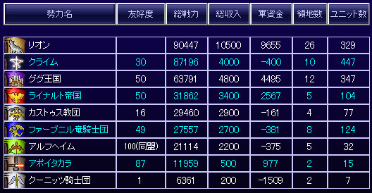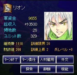 リオンの強みは軍資金かと思われそうだがそうではない(断言)。敵勢力はプレイヤーよりも少ない資金で上位ユニットを雇えるからね。リオンの強みは豊富な軍資金でかき集めた人材ユニットだ(断言)。