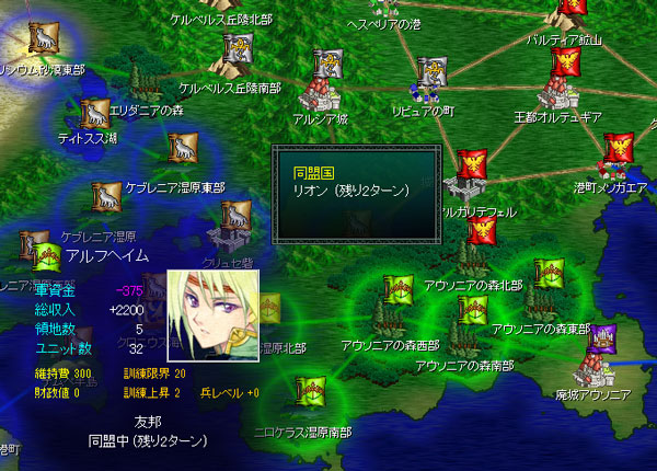 アルフヘイム(エルフ)が勢力を盛り返しています。2ターン後には同盟が切れちゃうんだって。さすがに3正面作戦をするほど戦力は無いから面倒くさいことになった。