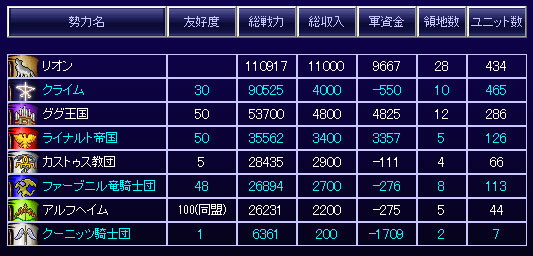 このターンはカストゥス教団の都市に攻め込みます。チェレニー海で敵の動きを抑えつつ山から中原に進出するのだ。教団は帝国と対リオン同盟を組んでいるから良策とは言いがたいが。