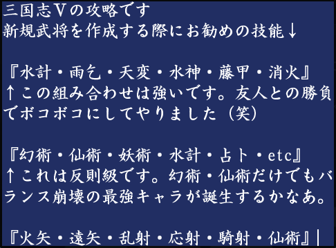 うーむ、三国志5をやりこんだ人による強力な特殊能力の組み合わせを検索してしまうとはなあ。これは凄い、まさに経験者は語るだ。いくつか例が記載されているけど、とりあえず僕のキャラを一番上にならんでいる『水計・etc』の技能にしてしまおう。
