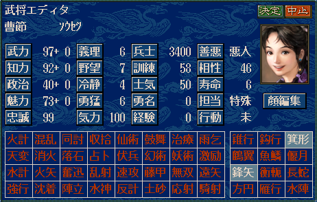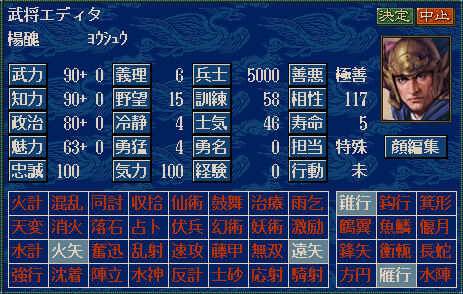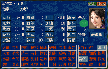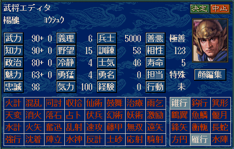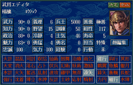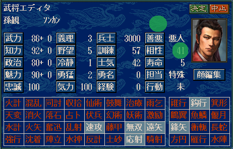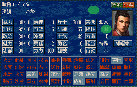 悠真「三国志5では、よほど相性が近いか血縁関係にある武将でないかぎり忠誠度99でも引き抜かれてしまう(たしか)。義理という要素もあるので絶対安全だとはいえないが(マスクデータはよくわからない)、これから仮想モードでゲームを始めるにあたり、お前と孫観の相性を同じ数字にする。相性が同じなら忠誠度が95くらいまでさげられても引き抜かれはしないはずだ(たぶん)。」
