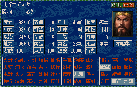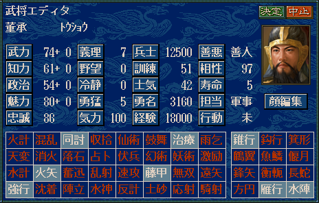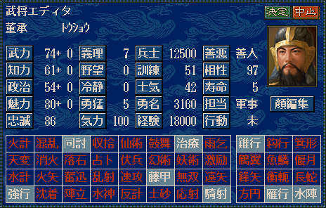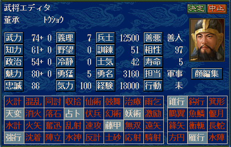 僕が董承をエディットすると『なんだよセンスねえなあー』などと悠真は文句を言った。ぐぬぬ、なんか文句があるのかよ。任意の能力にするにしてもベストなんて分からないよ。