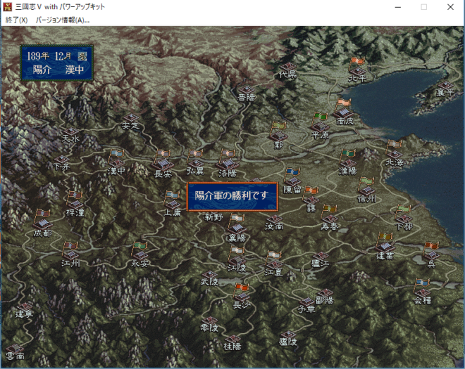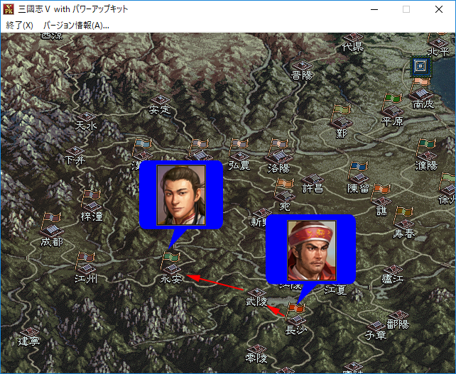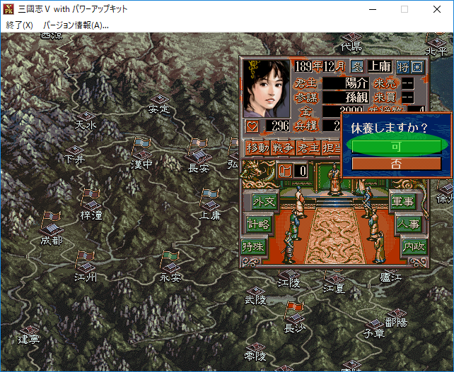 悠真「黄蓋は孫堅の配下だろ!?俺のいる永安から二つ経路を進んだ先にいるんだ!未行動なので孫堅は12月のターンをまだ実行していない!ゆえに、このままターンを終了させると、『12月・孫堅が武陵へ移動、1月・永安に進攻』となる可能性がある。妖術(4スクエア以内にいる部隊の訓練度と士気を下げる)と仙術(全味方部隊の士気を上げ、負傷兵を回復)を使う黄蓋なんかに襲われたら壊滅してしまう!」