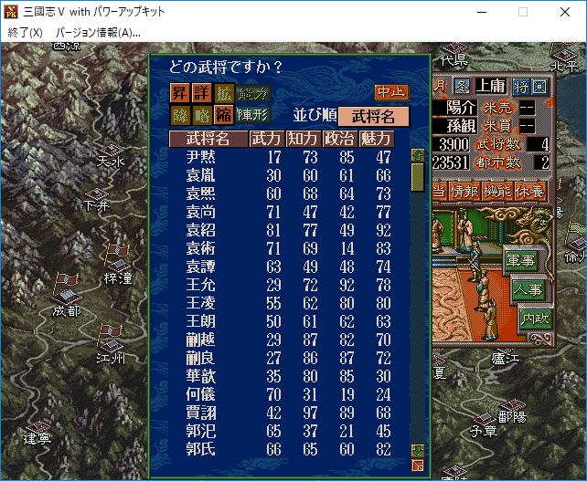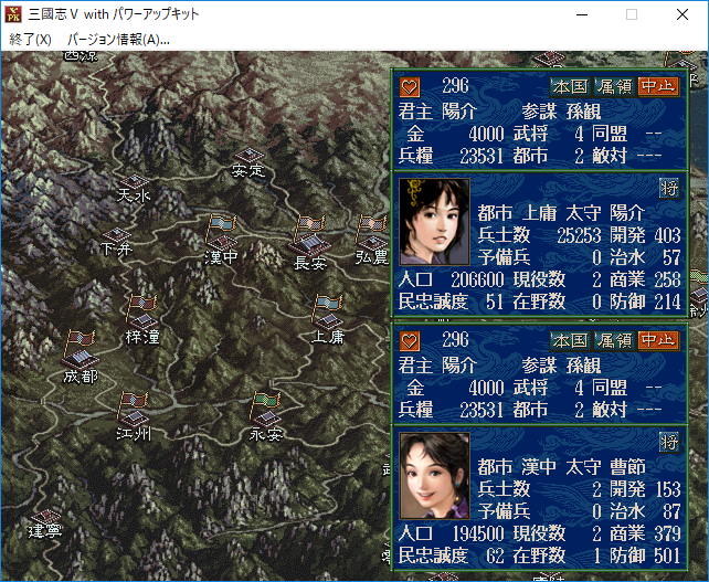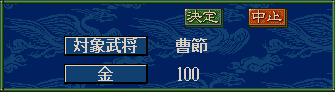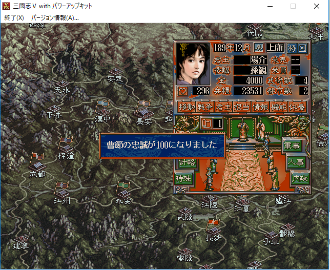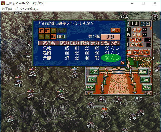僕は孫観を奪われてしまえば負けになる。悠真に孫観を引き抜かれないよう、曹節を見捨てて孫観の忠誠度を100にするという選択肢もある。しかし悠真が全ての武将で引き抜きを試みても孫観は裏切りに応じることは無かったのだ(持参金を0と1000にして武将を引き抜けるか確かめる方法がある)。同じく忠誠78の曹節も悠真の誘いを断ったので、このターンは忠誠度上昇をせず他の事をしても良いのだが。
