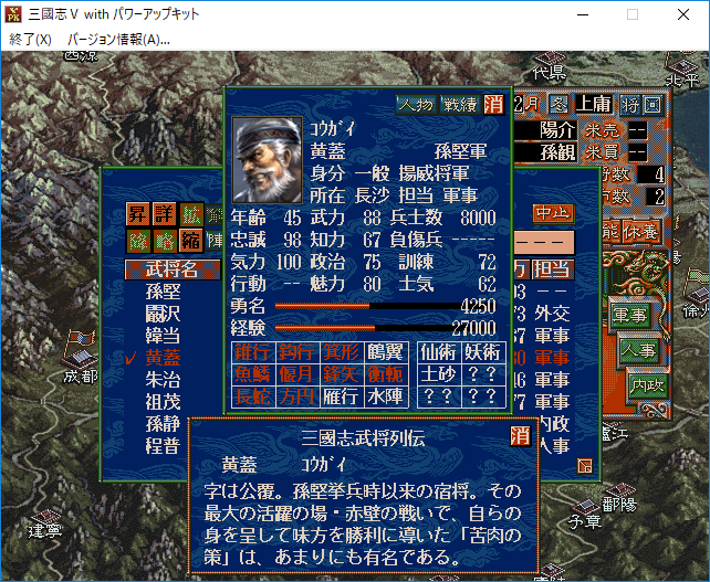 陽介「禁止の能力は仙術と妖術の二つ。まず仙術を『水陣』と史実モードにおいて一番最初に覚える『奮迅』にする。そして妖術を『治療』に変化をさせる。水陣はもう覚えてしまっているからもったいないと思うけどね。なんで黄蓋を例に出したの?」