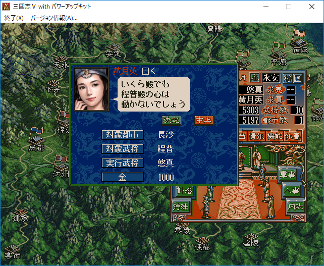 悠真はコマンドで辛憲英の忠誠度を100にした。