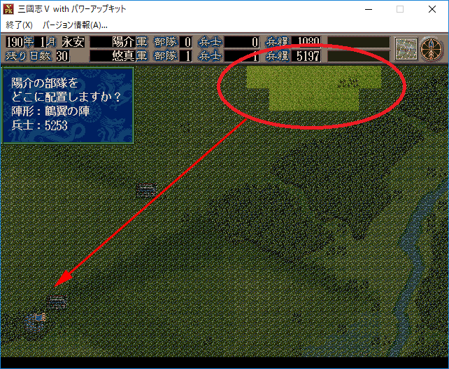 僕は赤い丸の位置が初期配置となり矢印の方向へ進軍するか、城から打って出てくる悠真を迎え撃つことになっていたわけだ。見てのとおり決戦の場は平地なので孫観の鋒矢の陣では打ち破られていただろう(注:攻略本で確認したら山岳陣形の活躍するマップでした)。