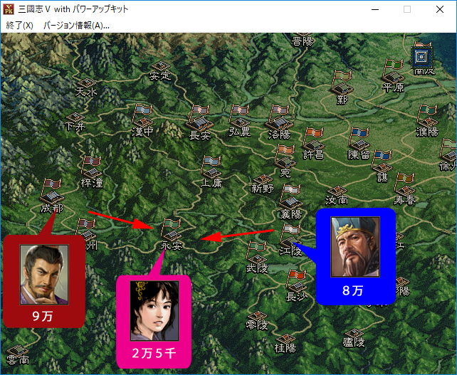 例えば僕がこのターンに永安へ侵攻したとする。結果、総兵力9万の劉焉や総兵力8万の劉表と緊張感が高まるのだ。
