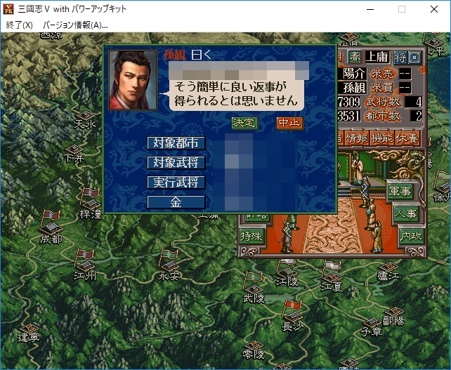 僕は民から反乱を起こされるようなプレイをしたら負けで良いと本気で思っている。しかし今は1月であり反乱のタイミングである4月まで時間はある。それに民忠51の上庸や、これから攻め入る民忠55の永安が、4月まで僕の都市でいてくれる確証はないという厳しい現実。十中八九、他の群雄に獲られるだろう。