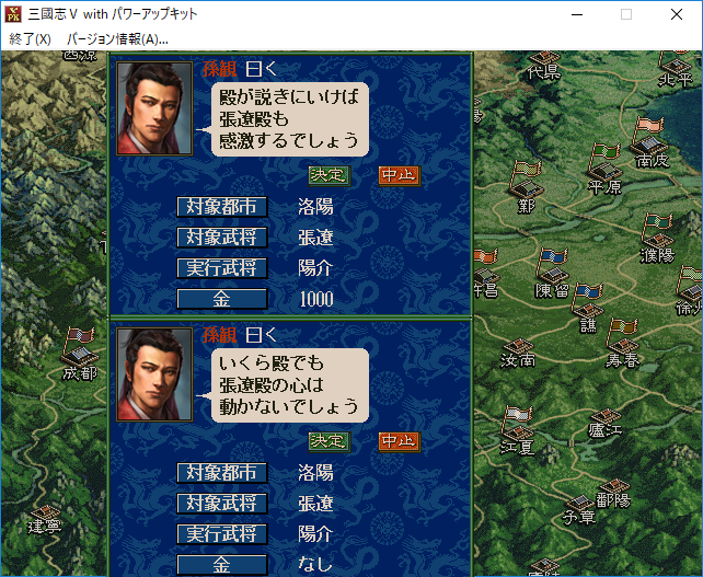 こちらの武将は何度ためしても(金0と金1000のやつ)登用することはできなかった。この武将さえ手に入れば永安攻略は確実になるので残念だと思っていたのだけど。