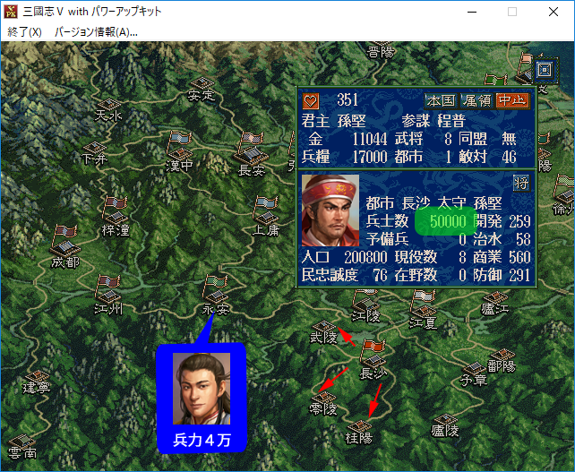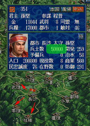 まあ孫堅の武陵移動を警戒してのことだろう。僕が民忠を上げるのに四苦八苦しているうちに早いところ桂陽まで逃げようとしているに違いない。
