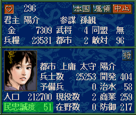悠真「このターンに優秀な人材を集めることもできた。しかし俺はコマンドを消費して辛憲英の忠誠度100へと上昇させる。引き抜きも通用しない独立もしない太守の完成というわけさ。今月は天命に恵まれなかったので民忠を上げることは適わなかったが来月には必ず民の満足する政治を実行する。お前さえ攻めてこなければな!」