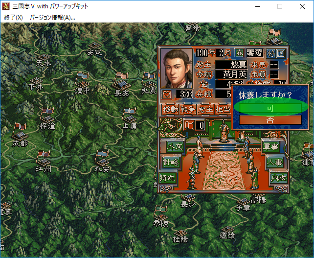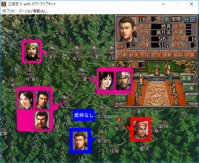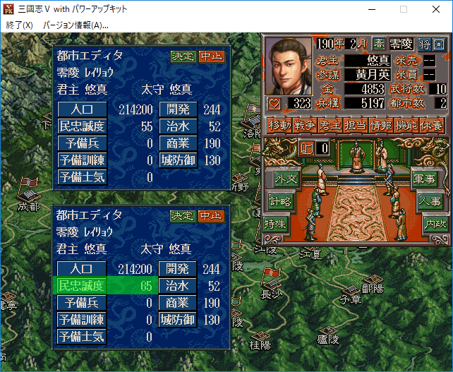 悠真「俺が唯一危惧しているのは、お前が武陵へ進攻してコマンドで金を使い孫堅と同盟をすることだ。そうなれば『天下三分の計』は破綻してしまう。しかしお前は『上庸』、『永安』、『武陵』と3都市の民忠を上げながら周辺都市との外交関係に気を配らなければいけなくなるよな?その間に俺は兵と兵糧と人材を集めて反撃をするのさ。お前は俺を荊州南部へ追い詰めていたつもりかもしれないけど、俺におびき出されていたというわけだ。これを『反客為主の計』という」