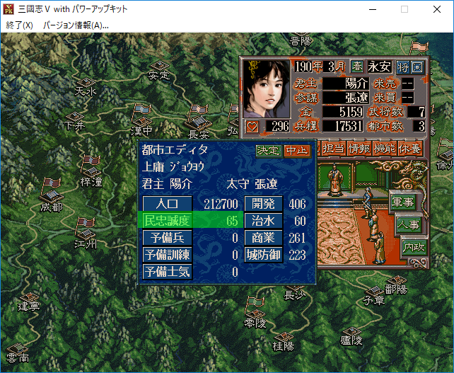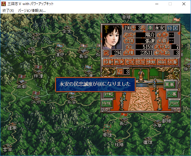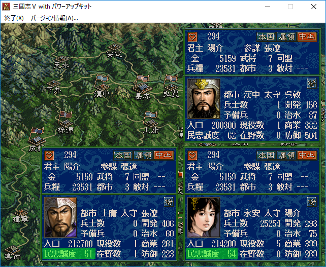 夢想の世界を漂うのはやめて現実に戻ろう。三国志5では1月、4月、7月、10月に都市の民忠が60以上にしないと反乱が起きてしまうらしい。僕と悠真は反乱を起きた時は敗北というルールを取り決めた。そして僕の所有している都市の民忠はというと。