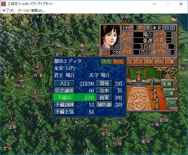 言霊で永安の予備兵を4200増やした(天命数×言霊数×100)。訓練度と士気は君主で募兵をした際の値になっている。