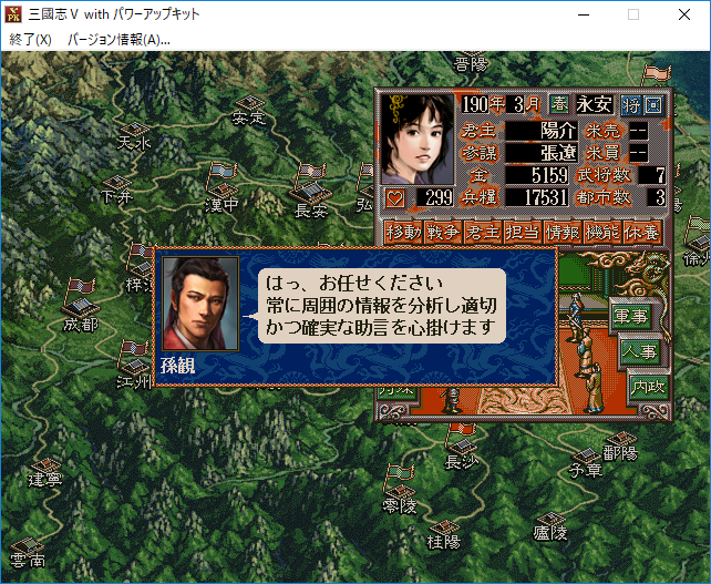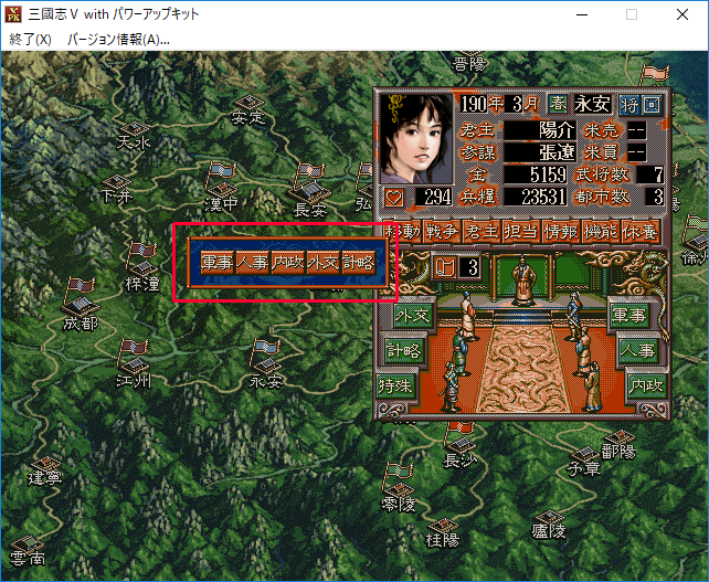 悠真「軍事、内政、特殊など武将に担当させるコマンドは1月、4月、7月、10月にならないと変えることができない。説明しにくいけど『特殊』を担当している武将のみ、いつでも他のコマンドへ変化させることができる。この辺はコンシューマー版の三国志5や携帯機版の三国志(三国志5に似てる)とは違うので戸惑う人もいるだろうな」