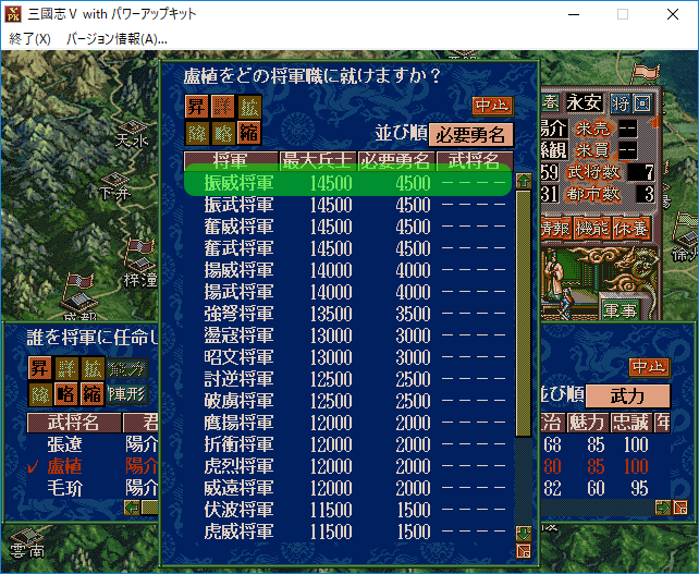 陽介「・・・ここからさらに募兵をして兵を増やすよ。まずは参謀を同じ都市にいる孫観に戻して、廬植が多くの兵を率いられるよう『振威将軍』へと昇進させる(支払わなければいけない給料も高くなる)」
