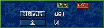 といいつつも、孫観の忠誠度を3上げるためだけにコマンドを使ってしまった(笑)。だって孫子の言霊で最大15まで忠誠度を下げられてしまうんでしょ?いくら相性が同じといっても何かの間違いで引き抜かれたら怖いからね。