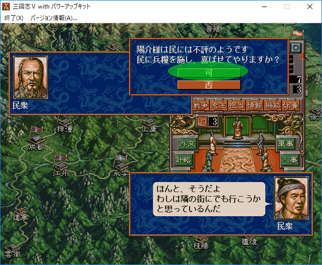 陽介「上庸と永安の民忠度が60よりも少ない。これを言霊無しで上昇させられれば良いんだけど。ねえ悠真、攻略本には『巡察』というコマンド民忠を上げられると書いてるよね?これってどういうこと?」