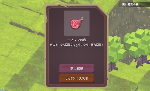 イノシシジュニアに勝った報酬として『イノシシの肉』を手に入れました。これも何かの魔法の素材になるのかな?