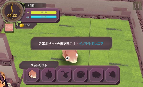 ペット使用のチュートリアルが始まりました。猫マークを押すとペットの能力を使用できるのでしょう。イノシシを押して敏捷性を上げます!