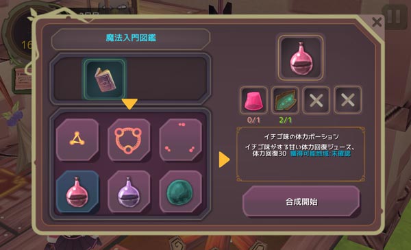 手持ちのアイテムで合成をできるか調べてみました。一番初歩的な回復アイテム、『イチゴ味のポーション』は作れないみたいですね。HPが30も回復をするのか。