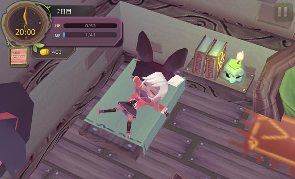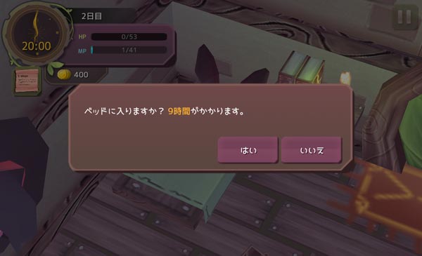 HPは0、MPは1になってしまった。もうちょっと島を探索したかったけど仕方がない。寝て体力を回復させます。