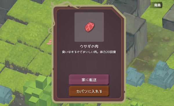 あら?さっきのウサギちゃんとは違うアイテムを落としましたね。ウサギの肉かあ。南島の探索は失敗することもあるし報酬もランダム性がある。何度も来ることになりそうです。