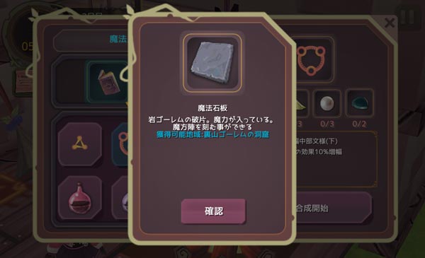 念のため魔法の合成に必要な素材も見ておきます。数ある素材のうち1つ目は裏山のゴーレムの洞窟で手に入る魔法石版。うーむ、魔法は諦めようか(笑)。
