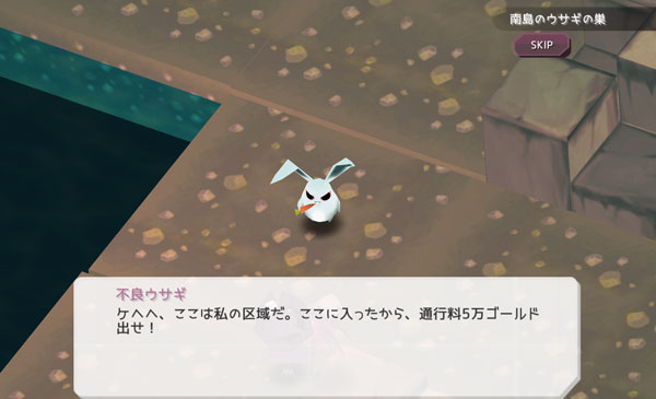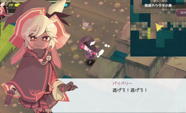 モンスターの名前は不良ウサギ。パイベリーに通行料を要求してきました。この後に戦闘をすることになります。今は体力が減っている。いったん逃げてHPを回復させましょう。