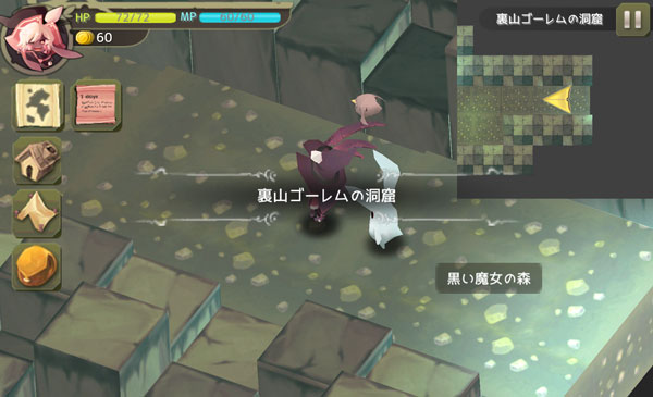 歩いておうちの裏に行くと、本当に洞窟があった!よーし、魔法を合成して一気に強くなるチャンスだぞお。何が何でも制覇をする!せめて素材くらいは持ち帰る!