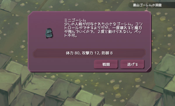 道を阻むミニゴーレムと遭遇。こいつとは戦闘を避けられないんだよな。1発で倒せるようになれば楽になりそうです。