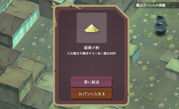 たしか硫黄が1つ足りなかったよね。こいつも拾っておくのです。次の魔法のために今から集めておくのが大切なんだろうなあ。全く拾っていないとレシピを手に入れても合成出来るのが10日後とかになりそうだ。