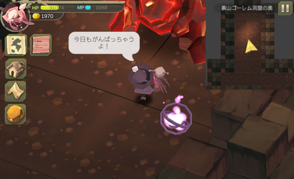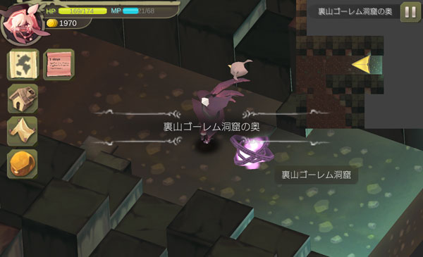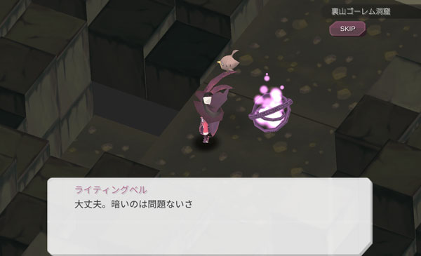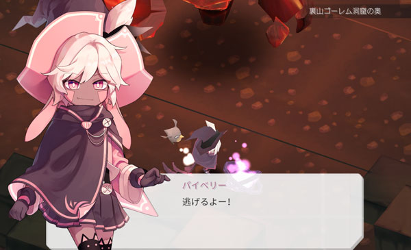 こんにちは!魔女の泉のプレイ日記を始めます!ペットのライティングベルと一緒に裏山ゴーレムの洞窟に来ました。洞窟の奥には商人ラルフから依頼されたアイテムがあるはずです。頑張って依頼を達成しましょう。