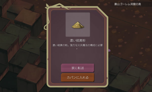 よーし、濃い硫黄粉を見つけたぞお。これも『五球地点爆発の中央魔法陣』に必要な素材なんだけど取れる場所が分からなくて困っていたんだ。