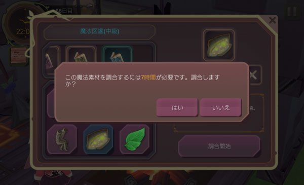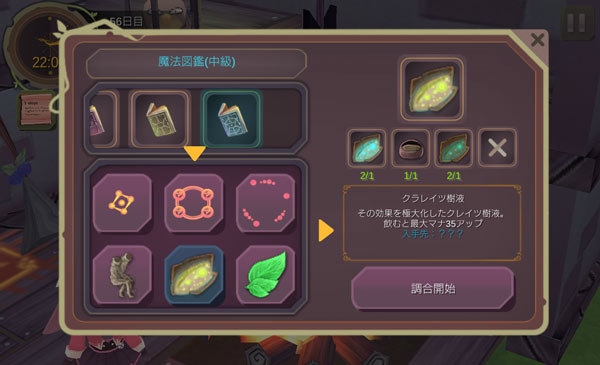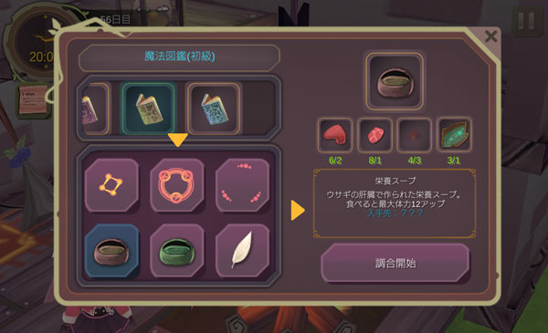 次は栄養スープとドーピングアイテムを素材にしてクラレイツ樹液を合成します。効果の高いアイテムだが作成するのに7時間もかかるのです。