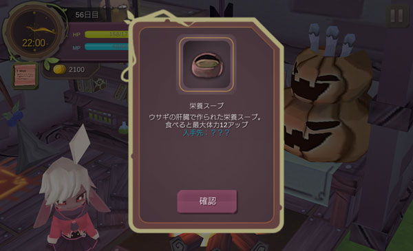ウサギ狩りを頑張ったが1つしか栄養スープを作れない。セーブ&ロードを繰り返せばもう1つ作れそうだけど、そこまで必死にならなくてもいいだろう。