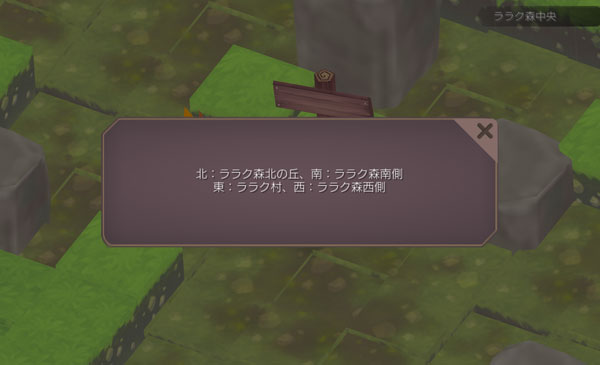 ララク森中央に来ました。2つ目の十字路ですね。ここを東に進むとララク村の人々に通報をされます。迷子にならないよう立て札を読もう。