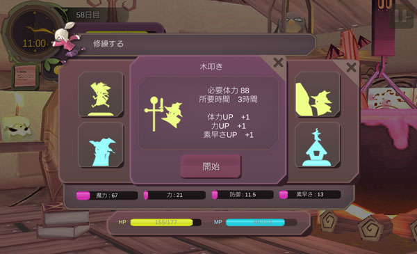 回復アイテムを使いつつ木叩きを2回実行して素早さを上げましょう。時間の消費は惜しいけど他にできることがない。