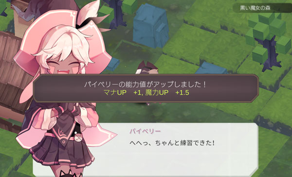 余ったマナは魔術の実戦練習に使います。焼け石に水みたいな修練だけどね。修練後のパイベリーが笑顔で楽しそう。木叩きよりも魔法練習の方が好きなのかな。