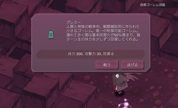 このゴーレムはペットになりそうですね。体力も少ないし攻撃少ないから弱そう。無視して外へ出ようかとも考えたが戦うことにした。今のままでは何の収獲もなく撤退することになる。