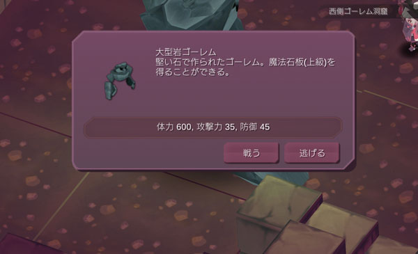 この洞窟は道が入り組んでおり迷いやすい。前回は遭遇をしなかった大型岩ゴーレムとエンカウントをしました。魔法石版(上級)を素材に使うアイテムは知らない。戦うのはやめておきましょう。