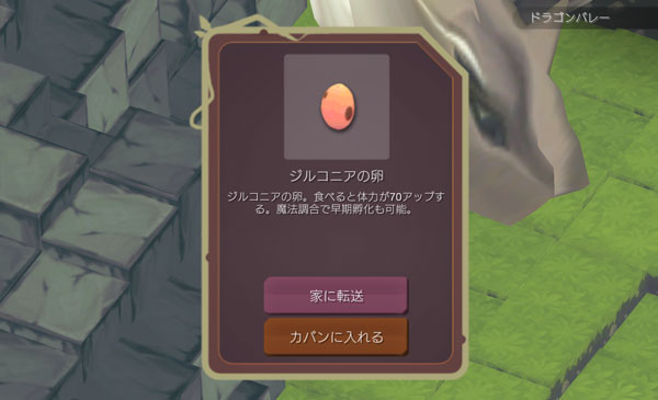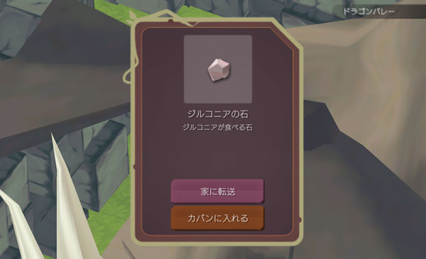ドラゴンの巣の近くにジルコニアの石が落ちていました。ジルコニアが食べる石!?よくわからないけど家に転送をします。