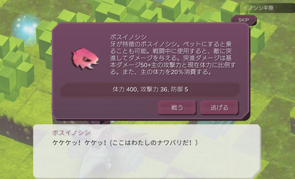 もしかしたら魔法の効かないボスが登場する可能性がある。そうじゃないと、なぜ『力』という能力値があるのか分からない。ボスイノシシは魔力に依存をしないダメージを敵に与えます。いつかは役に立つだろうと捕獲を試みる。