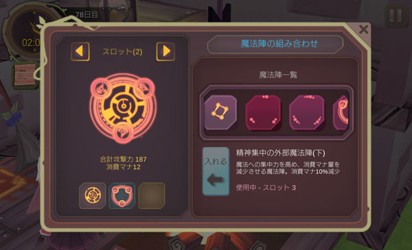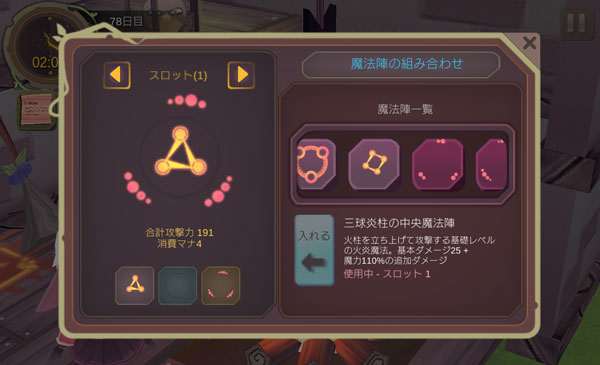 スロット1の魔法は三球炎柱の中央魔法陣です(一番最初に作った魔法陣)。消費マナの少ないこいつを何度も敵にぶっ放す戦術になります。