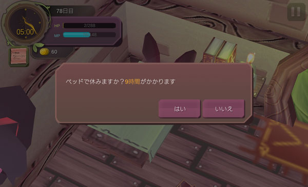 睡眠をとって疲労を回復させます。起きたら78日目の14:00になっているわけですね。プレイをしていた当時は半分自暴自棄になっていました。時間切れが迫っているのに未知のダンジョンへ行くなんて諦めたくなっちゃう。