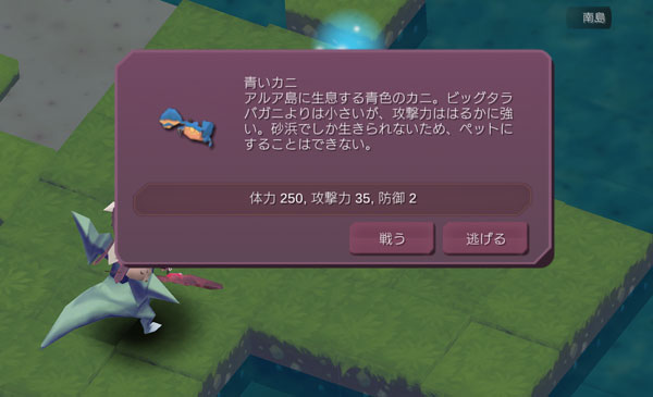 青いカニと遭遇をする。初めて戦った時は負けたんだよなあ。今なら1撃で倒せるくらいパイベリーも成長をしただろう。